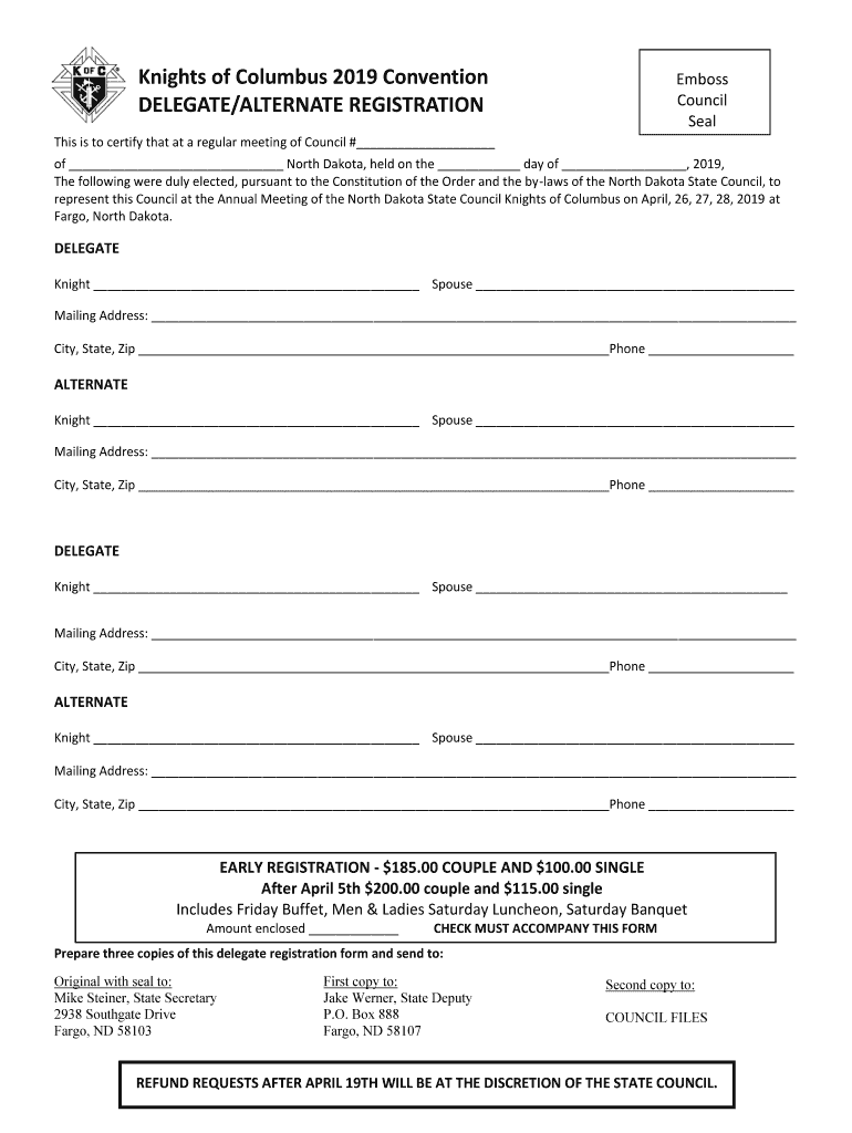 Knights of Columbus 2019 Convention DELEGATE/ALTERNATE REGISTRATIONEmboss Council Health is to certify that at a regular meeting of Council # of North Dakota, held on the day of, 2019, The following