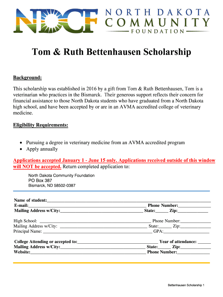 Tom & Ruth Bettenhausen Scholarship Background: This scholarship was established in 2016 by a gift from Tom & Ruth Bettenhausen, Tom is a veterinarian who practices in the Bismarck. Their generous