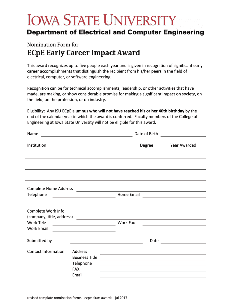 Nomination Form force Early Career Impact Award Thisawardrecognizesuptofivepeopleeachyearandisgiveninrecognitionofsignificantearly careeraccomplishmentsthatdistinguishtherecipientfromhis/herpeersinthefieldof