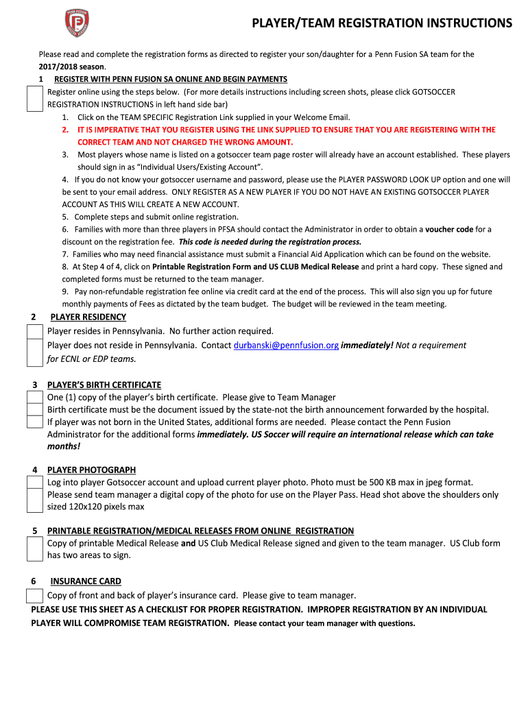 Please read and complete the registration forms as directed to register your son/daughter for a Penn Fusion SA team for the