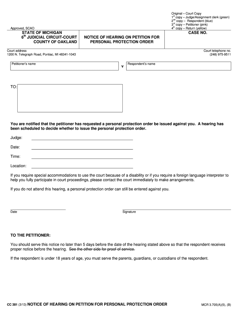 Original Court Copy st 1 copy Judge/Assignment clerk (green) ND 2 copy Respondent (blue) rd 3 copy Petitioner (pink) TH 4 copy Return (yellow) Approved, SCAN STATE OF MICHIGAN 6th JUDICIAL CIRCUITOUS
