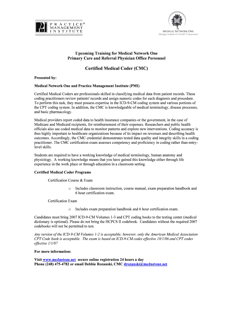 Upcoming Training for Medical Network One Primary Care and Referral Physician Office Personnel Certified Medical Coder (CMC) Presented by: Medical Network One and Practice Management Institute (PMI)