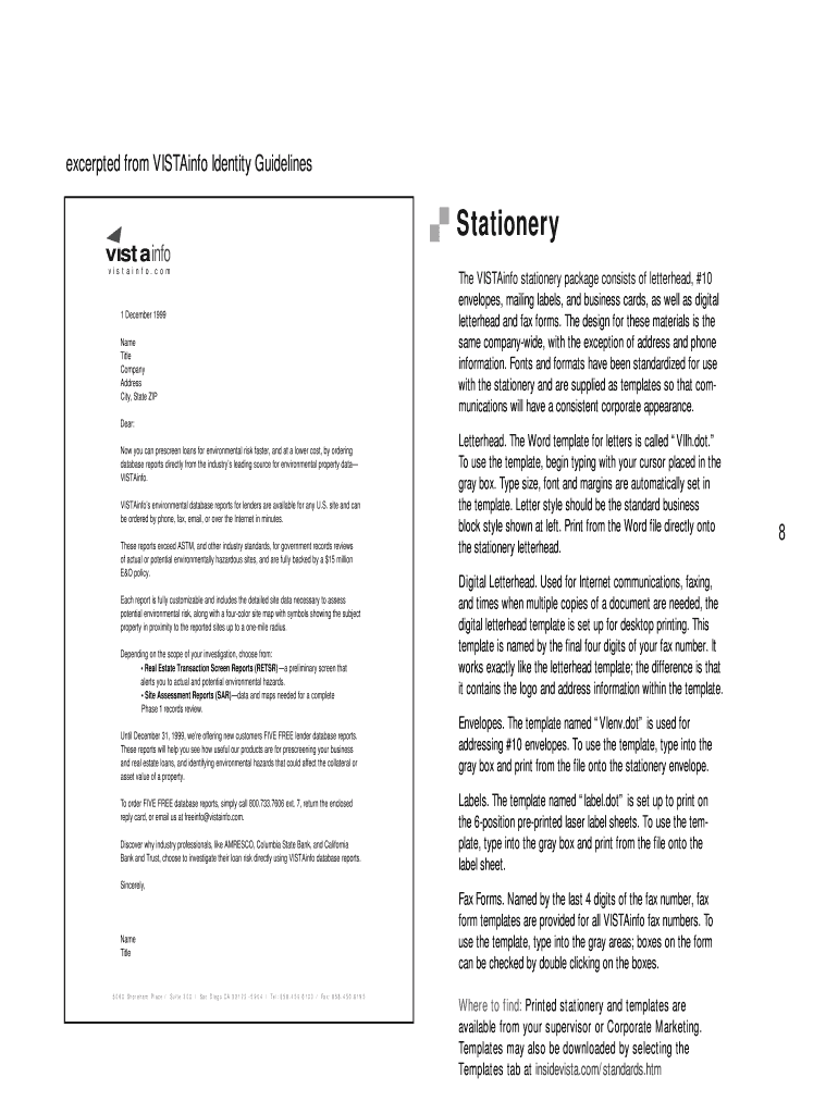 Excerpted from VISTA info Identity Guidelines. Stationery vista info v i s t an i n f o. c o m 1 December 1999 Name Title Company Address City, State Zips The VISTA info stationery package consists