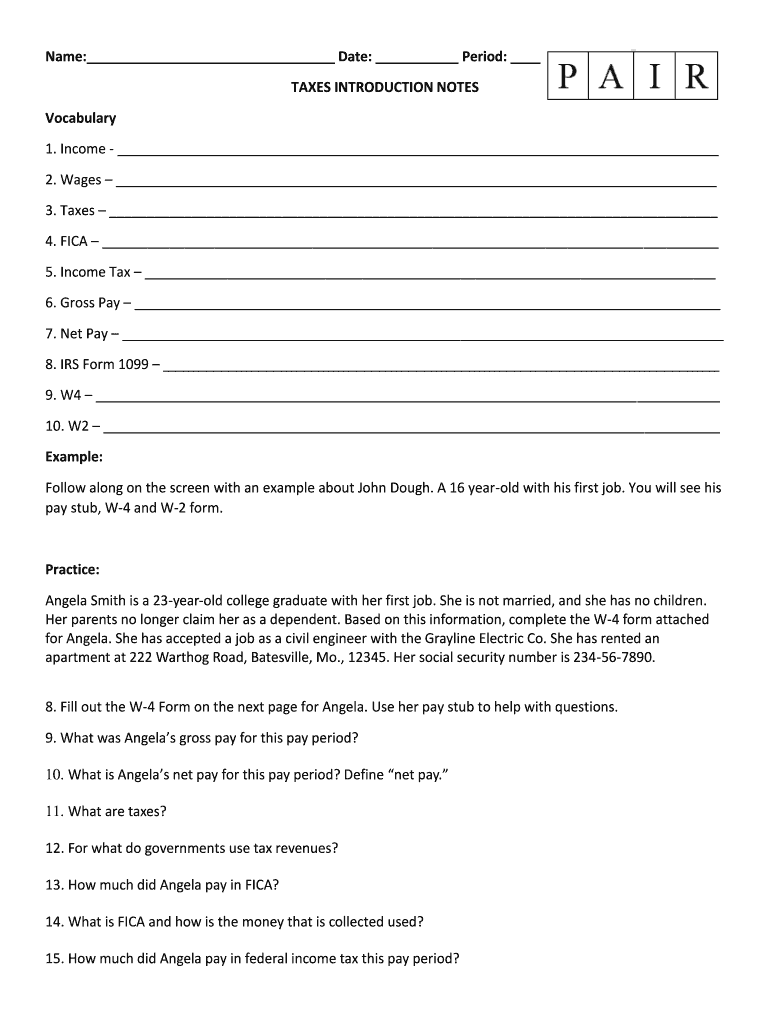 Name: Date: Period: TAXES INTRODUCTION NOTES Vocabulary 1. Income 2. Wages 3. Taxes 4. FICA 5. Income Tax 6. Gross Pay 7. Net Pay 8. IRS Form 1099 9. W4 10. W2 Example: Follow along on the screen