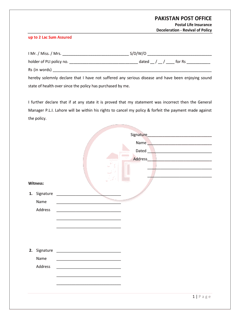 Get the free Pakistan Post Office PLI Policy Revival Declaration