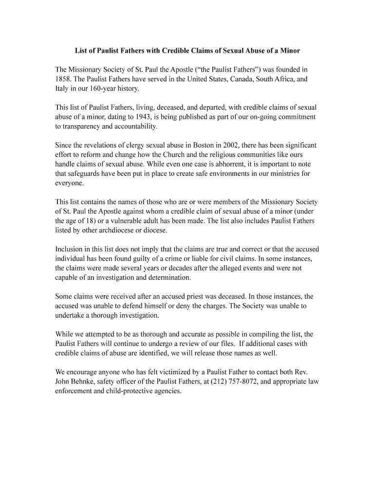 List of Paulist Fathers with Credible Claims of Sexual Abuse of a Minor