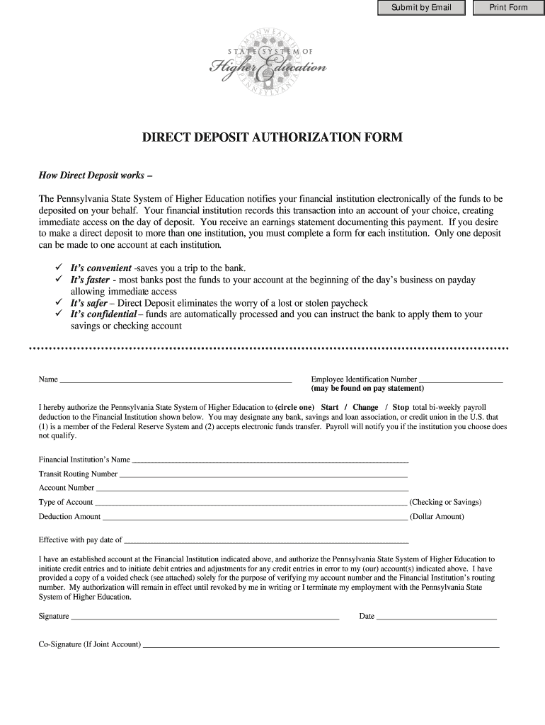 The Direct Deposit Authorization Form is a payroll document used by employees of the Pennsylvania State System of Higher Education to authorize the direct deposit of paychecks into a chosen financial institution.
