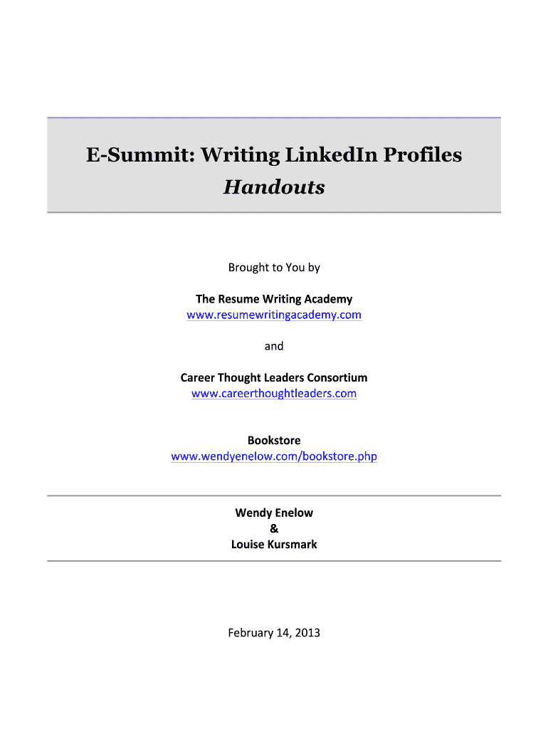 Summit: Writing LinkedIn Profiles HandoutsBroughttoYouby TheResumeWritingAcademy www.resumewritingacademy.com and CareerThoughtLeadersConsortium www.careerthoughtleaders.com Bookstore www.wendyenelow.com/bookstore.php