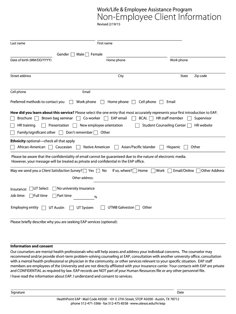 The form is intended for non-employee clients who seek support from the Employee Assistance Program (EAP) at the University of Texas.