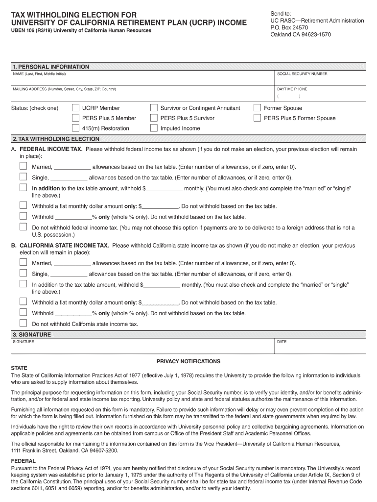 TAX WITHHOLDING ELECTION FOR UNIVERSITY OF CALIFORNIA RETIREMENT PLAN UCRP INCOME UBEN 106 R9/15 University of California Human Resources The laws and UC policies governing tax withholding vary according to the type of payments you are receiving your residency status and where your payments are sent. This form is available on the UCnet website ucnet. universityofcalifornia.edu/forms/pdf/ uben-106. pdf or call the Retirement Administration Service Center at 800-888-8267 to request a form. If...