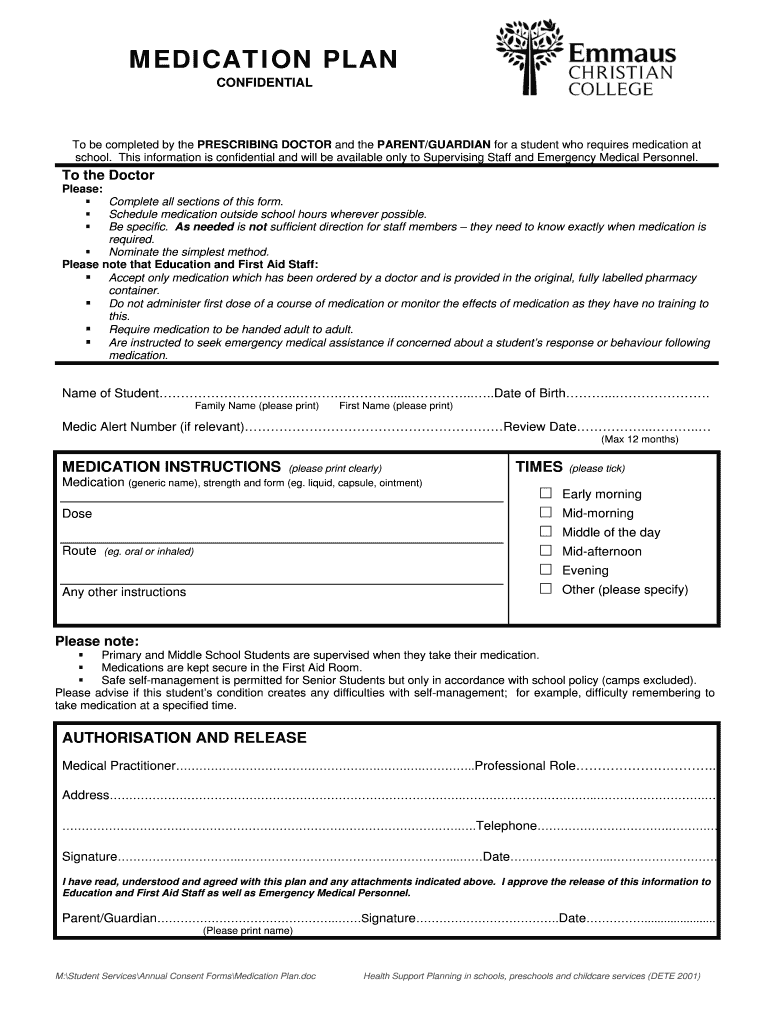 MEDICATION PLAN CONFIDENTIAL To be completed by the PRESCRIBING DOCTOR and the PARENT/GUARDIAN for a student who requires medication at school. This information is confidential and will be available