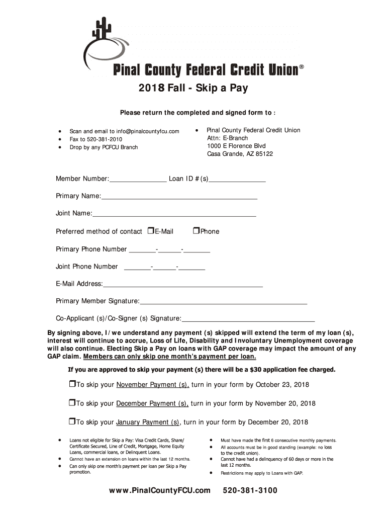 2018 Fall Skip a Pay Please return the completed and signed form to : Scan and email to info pinalcountyfcu.com Fax to 5203812010 Drops by any PCC Branching County Federal Credit Union Attn: Branch
