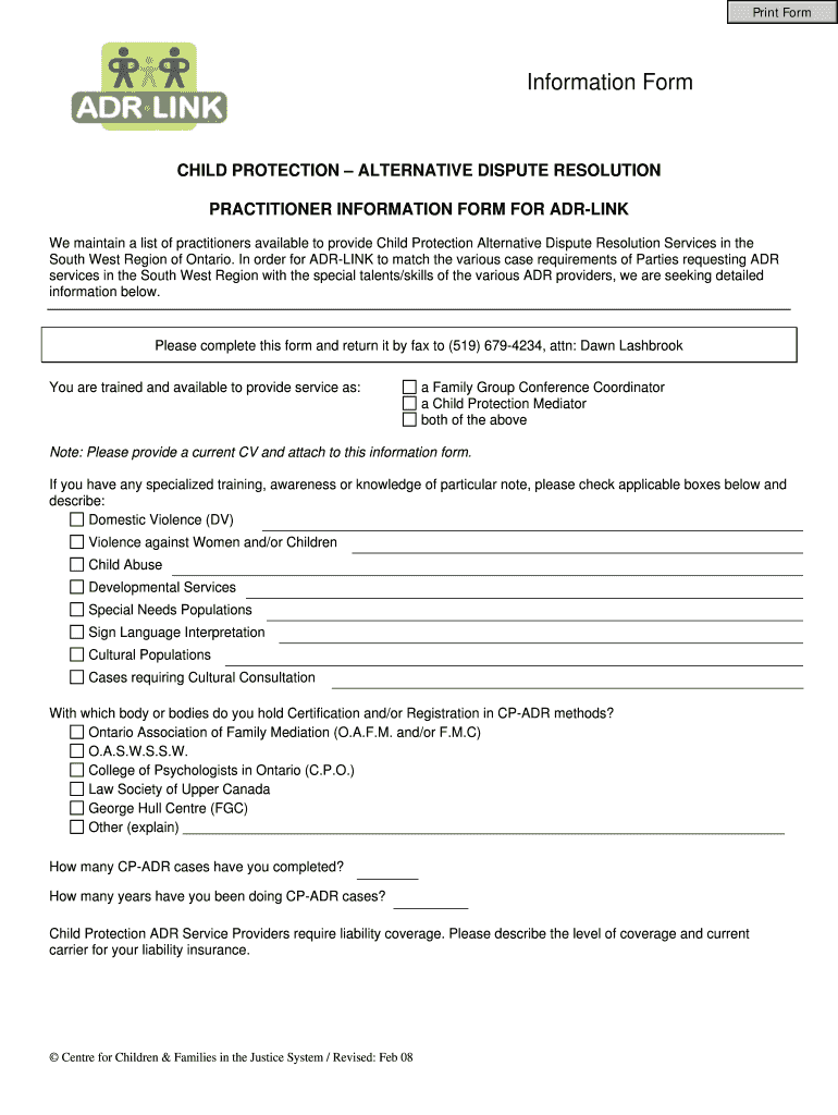 Print Form Information Form CHILD PROTECTION ALTERNATIVE DISPUTE RESOLUTION PRACTITIONER INFORMATION FORM FOR AIRLINE We maintain a list of practitioners available to provide Child Protection Alternative