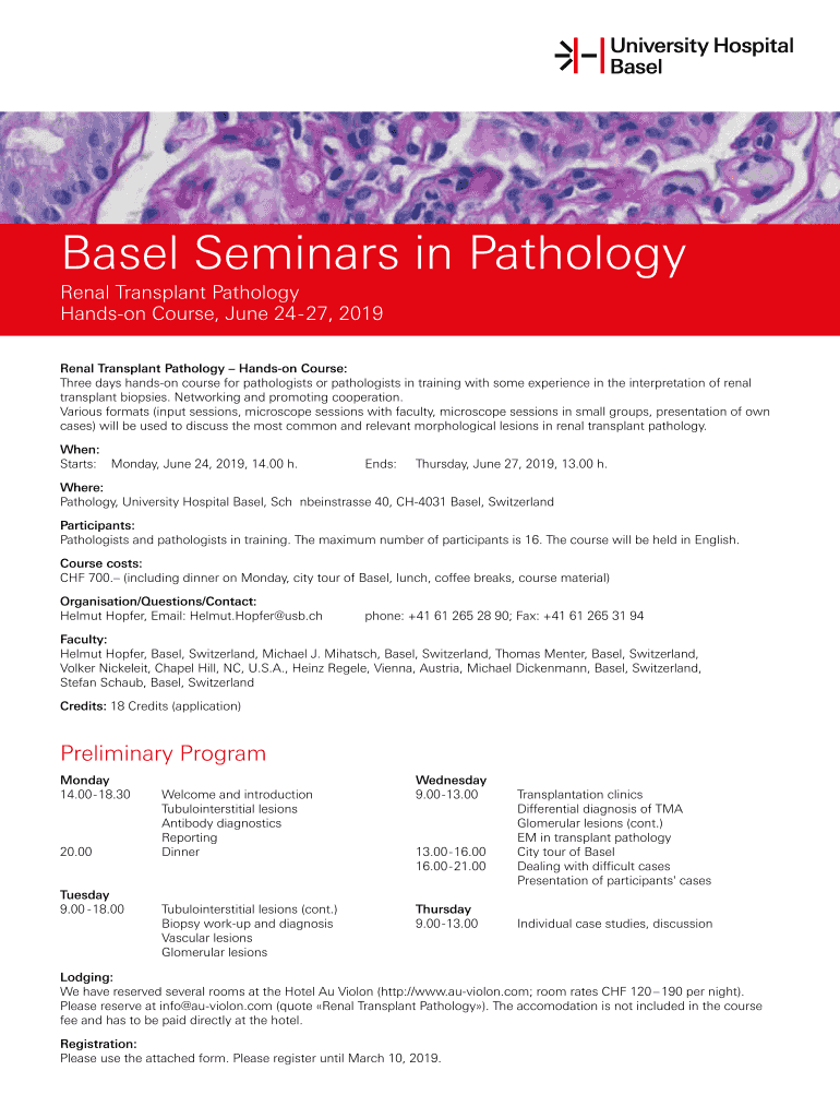 Basel Seminars in Pathology Renal Transplant Pathology Hanson Course, June 24 27, 2019 Renal Transplant Pathology Hanson Course: Three days Hanson course for pathologists or pathologists in training