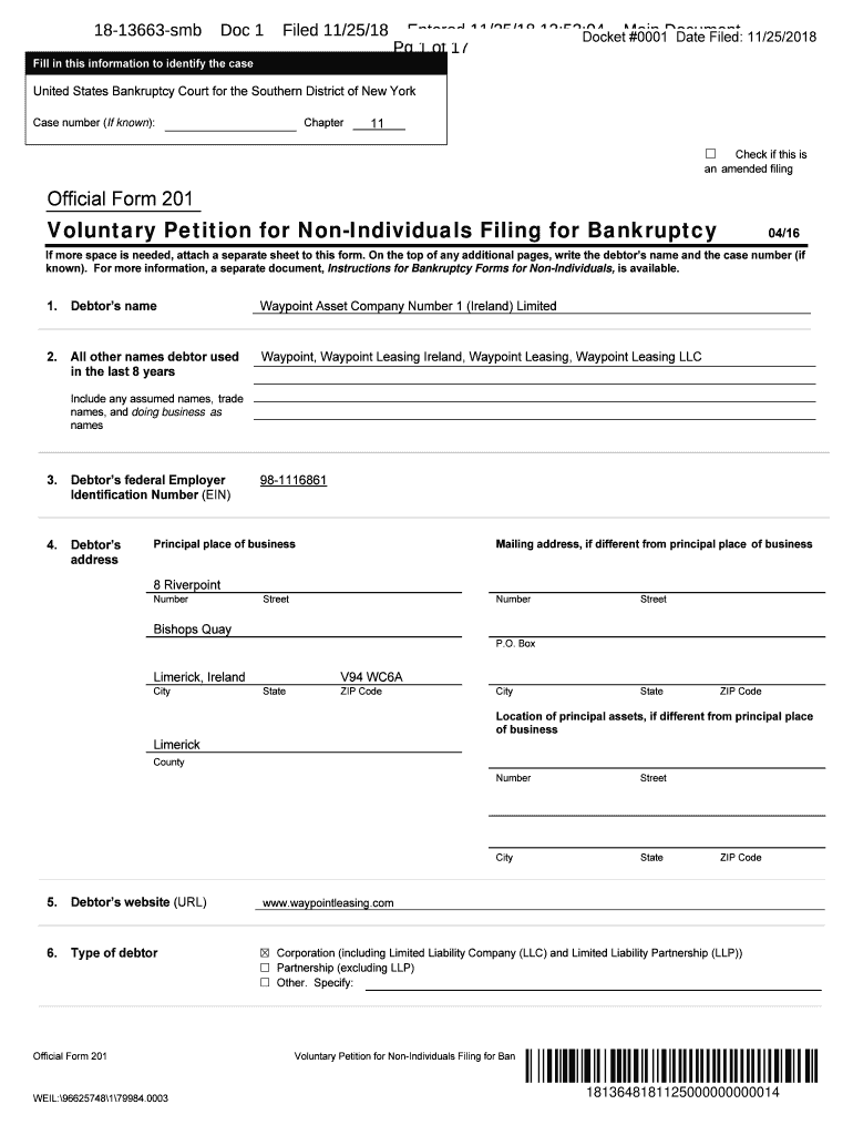 1813663smbDoc 1Filed 11/25/18Entered 11/25/18 13:52:04 Docketing #0001Document Date Filed: 11/25/2018 Pg 1 of 17Fill in this information to identify the reunited States Bankruptcy Court for the Southern