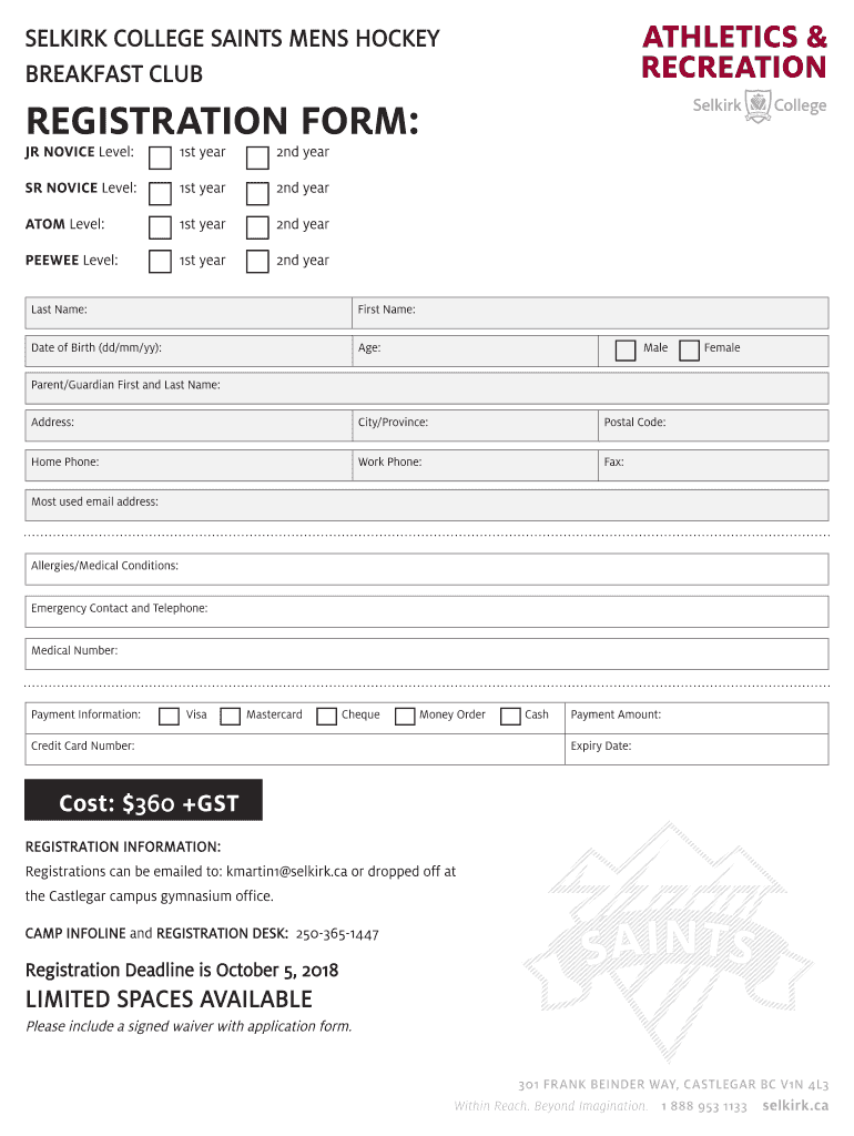 ATHLETICS & RECREATIONSELKIRK COLLEGE SAINTS MEN HOCKEY BREAKFAST CLUBREGISTRATION FORM: JR NOVICE Level:1st year2nd years NOVICE Level:1st year2nd creator Level:1st year2nd yearPEEWEE Level:1st year2nd