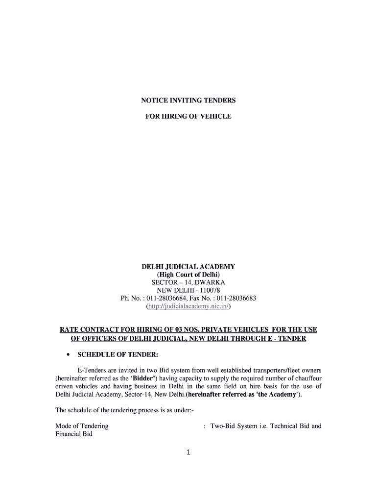 NOTICE INVITING TENDERS FOR HIRING OF VEHICLEDELHI JUDICIAL ACADEMY (High Court of Delhi) SECTOR 14, DARK NEW DELHI 110078 pH. No. 01128036684, Fax No. 01128036683 (http://judicialacademy.nic.in/)