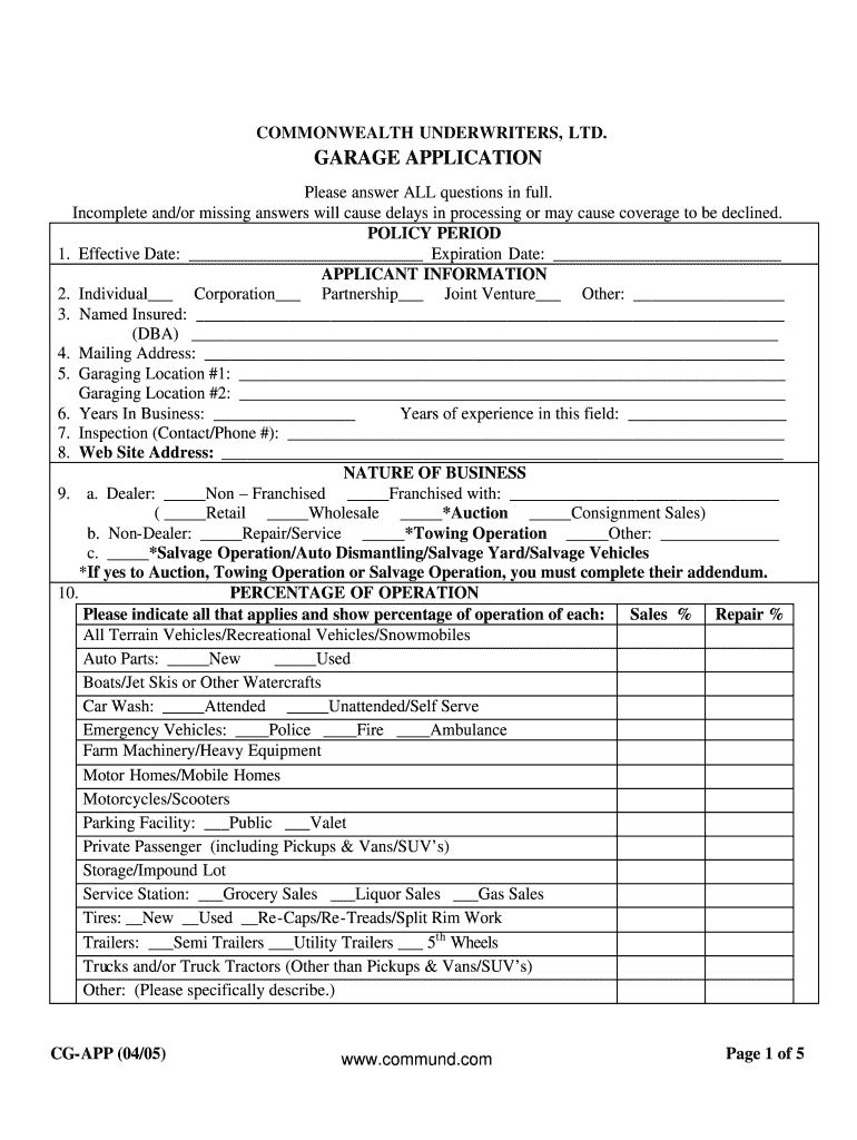COMMONWEALTH UNDERWRITERS, LTD. GARAGE APPLICATION Please answer ALL questions in full. Incomplete and/or missing answers will cause delays in processing or may cause coverage to be declined. POLICY