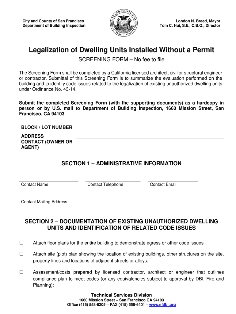 City and County of San Francisco Department of Building Inspection London N. Breed, Mayor Tom C. Hui, S.E., C.B.O., DirectorLegalization of Dwelling Units Installed Without a Permit SCREENING FORM