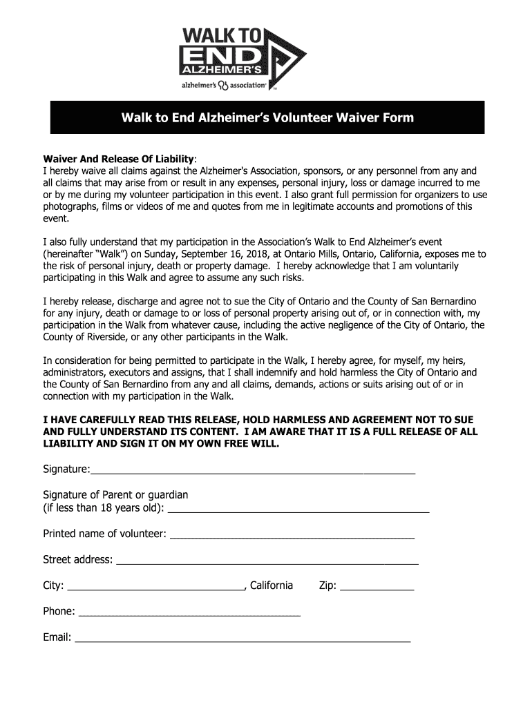 I hereby waive all claims against the Alzheimer\'s Association, sponsors, or any personnel from any and