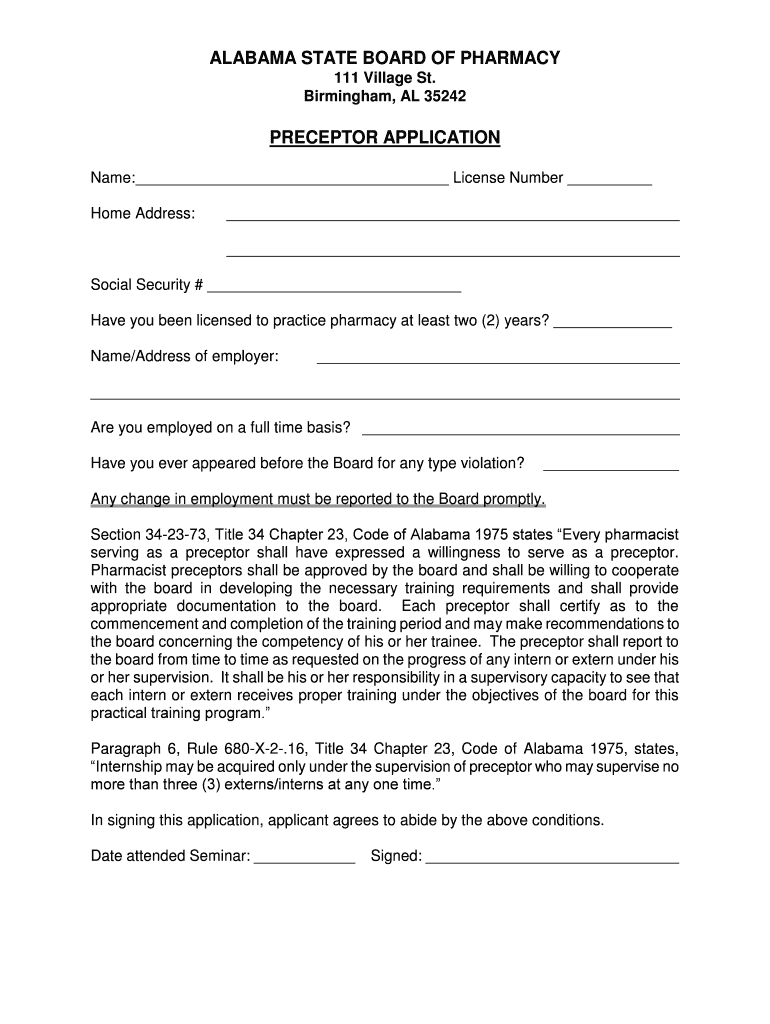 ALABAMA STATE BOARD OF PHARMACY 111 Village St. Birmingham, AL 35242PRECEPTOR APPLICATION Name: License Number Home Address: Social Security # Have you been licensed to practice pharmacy at least