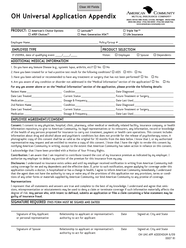 The OH Universal Application Appendix is a crucial form used by employees to apply for health insurance benefits through their employer. This application requires detailed medical information and outlines the benefits provided by the employer. Both the employee and their spouse must provide signatures to validate the application.