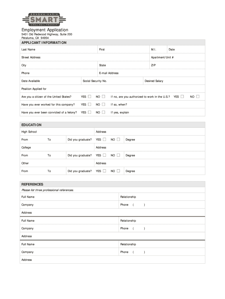 The Employment Application Form comprises several key sections, including personal details, education history, work experience, and references. Each section contains fillable fields and checkboxes, promoting user-friendly completion.