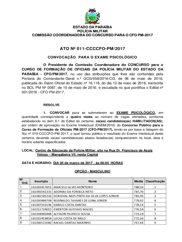 ESTATE DA Paraná POL CIA MILITARY COMICS COORDINATOR DO CONCURS PARA O CFO PM2017ATO N 011CCCCFOPM/2017 NONVOCAL PARA O EXAM PSICOLGICO O President the Comics Coordinator do CONCURS para o CURS ODE