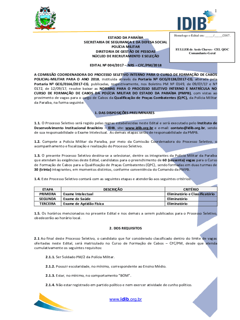 1ESTADO DA Paraná SECRETARIAT DE SEGURA E DA DEF ESA SOCIAL POL CIA MILITARY DIRECTORIAL DE GUSTO DE PERSONS CLEO DE RECRUITMENT E SELEOHomologo o Edital em: ___/___/2017.FULLER de Assis Chaves CEL