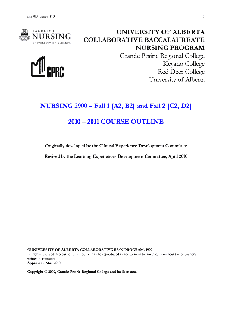 Ns2900 varies f10 1 UNIVERSITY OF ALBERTA COLLABORATIVE BACCALAUREATE NURSING PROGRAM Grande Prairie Regional College Kano College Red Deer College University of Alberta NURSING 2900 Fall 1 A2, B2