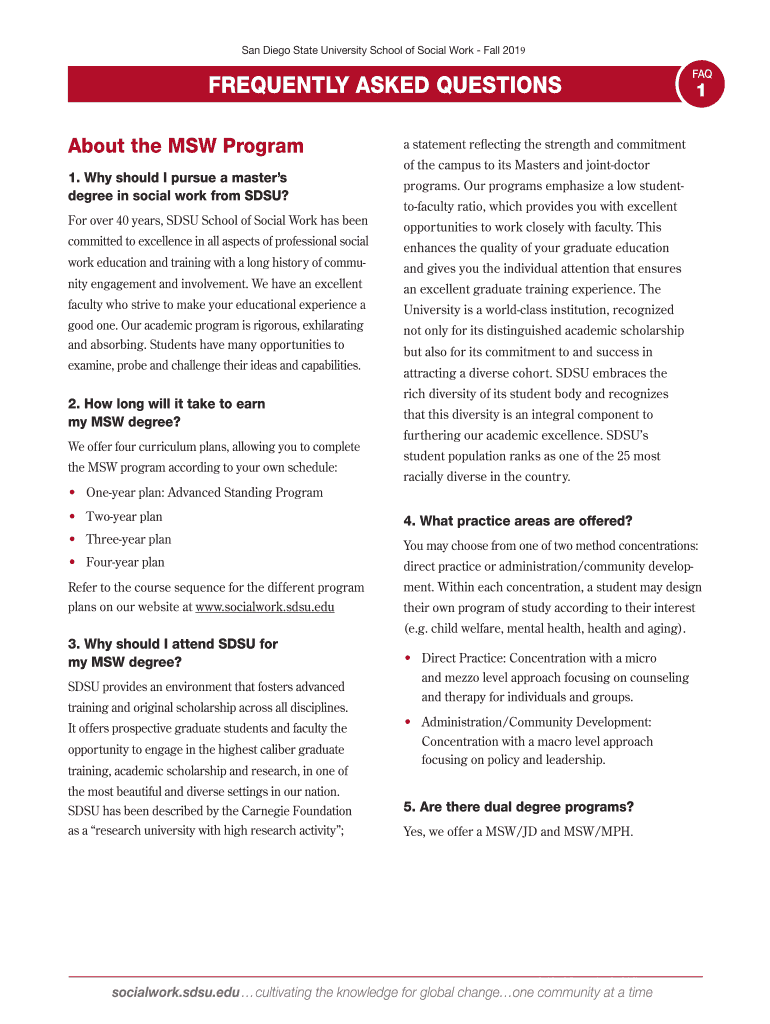 San Diego State University School of Social Work Fall 2019FREQUENTLY ASKED QUESTIONS About the MSW Program statement reflecting the strength and commitment1. Why should I pursue a master’s degree