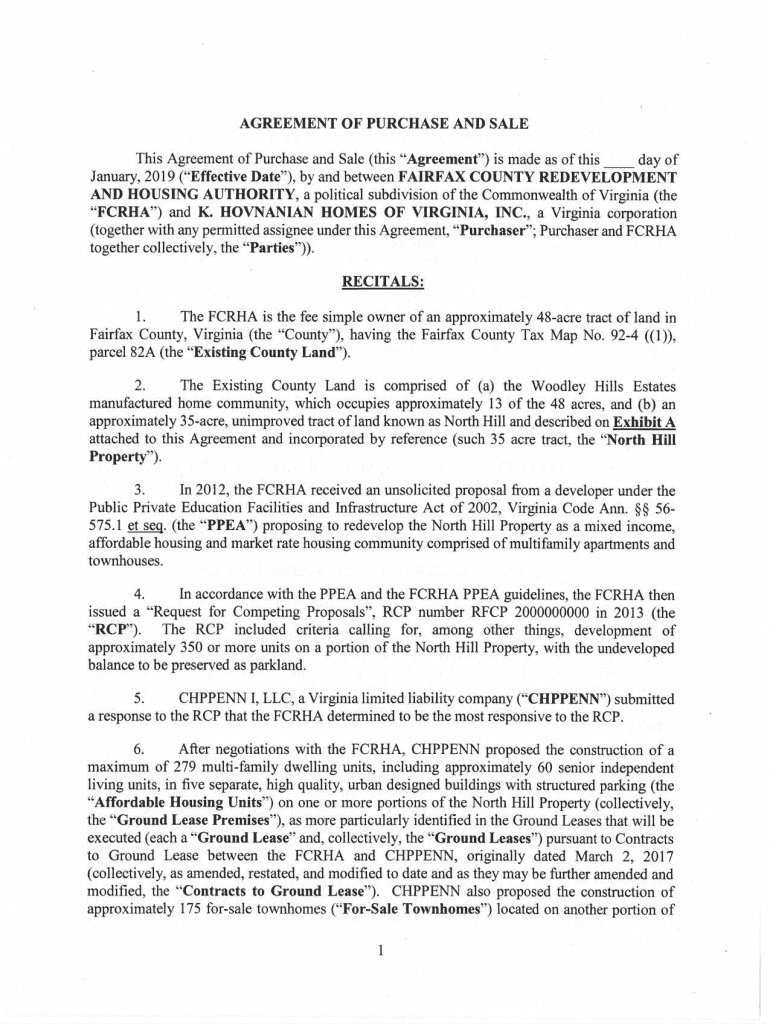 AGREEMENT OF PURCHASE AND Sales Agreement of Purchase and Sale (this “Agreement “) is made as of this day of January 2019 (“Effective Date “), by and between FAIRFAX COUNTY REDEVELOPMENT AND