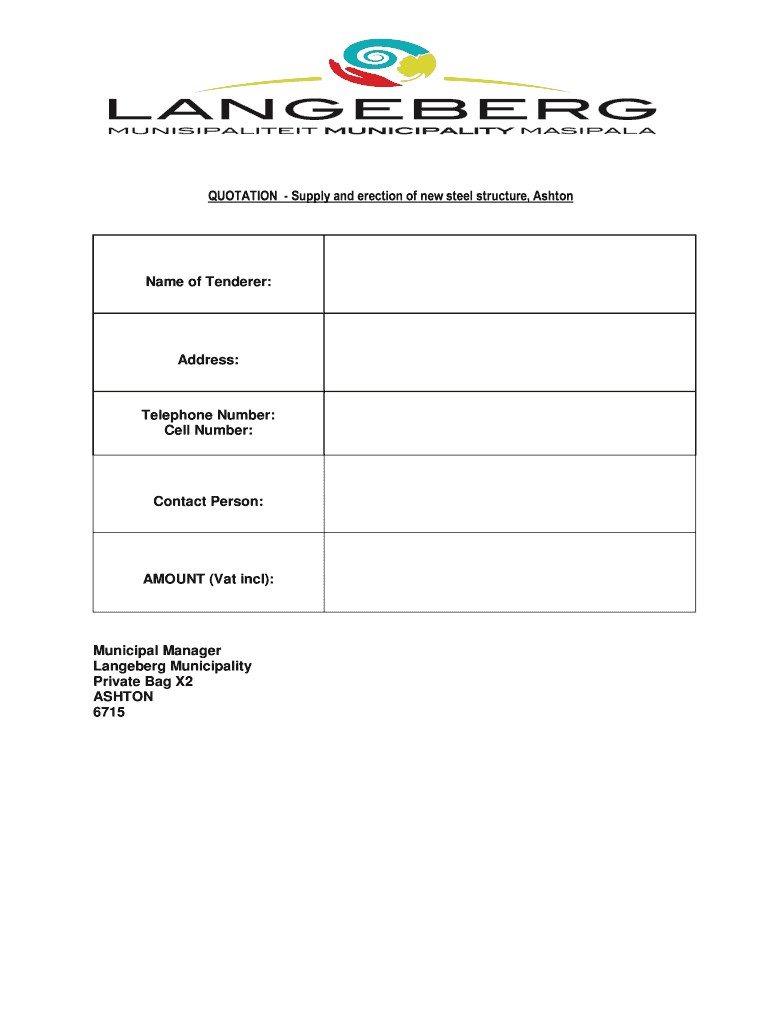 1/45QUOTATION Supply and erection of new steel structure, AshtonName of Tenderer:Address:Telephone Number: Cell Number:Contact Person:AMOUNT (Vat incl):Municipal Manager Weinberg Municipality Private