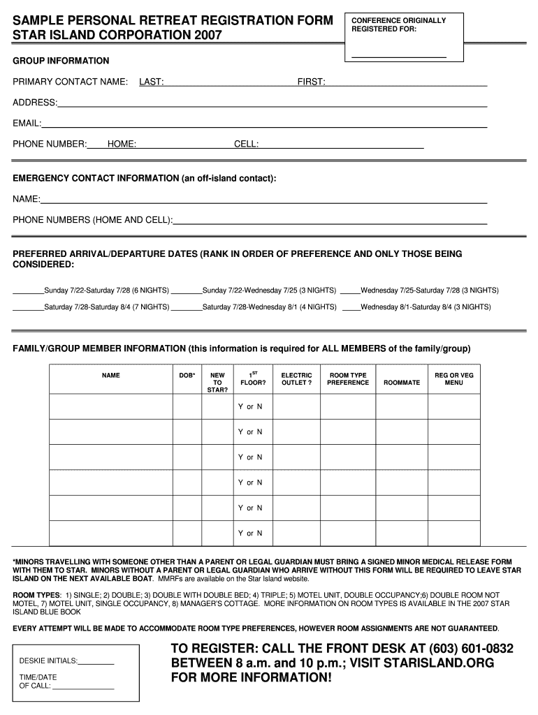 SAMPLE PERSONAL RETREAT REGISTRATION FORM STAR ISLAND CORPORATION 2007 CONFERENCE ORIGINALLY REGISTERED FOR: GROUP INFORMATION PRIMARY CONTACT NAME: LAST: FIRST: ADDRESS: EMAIL: PHONE NUMBER: HOME: