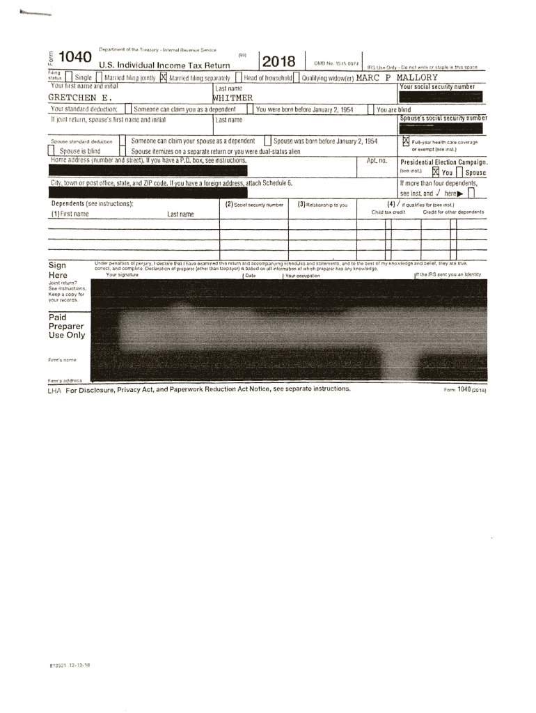 1040u. U.S. Individual Income Tax Return Married falling separately IRS 1Jiu1 Bonehead of householdOualilylng widow(CR)Do not WR, LC her :, too OHL!l o:CEMAC P MALLORYGRETCHEN E. Your standard deduction: