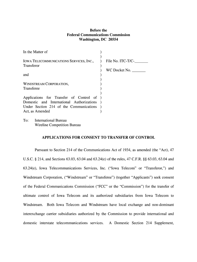 Before the Federal Communications Commission Washington, DC 20554 In the Matter of)) IOWA TELECOMMUNICATIONS SERVICES, INC., ) Transferor)) and)) MIDSTREAM CORPORATION, ) Transferee)) Applications