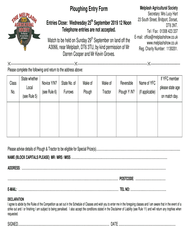 Entries Close: Wednesday 25th September 2019 12 Noon