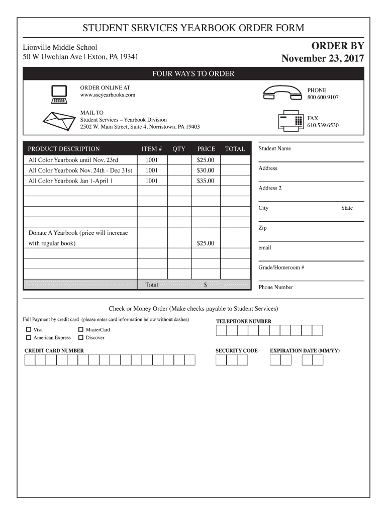 STUDENT SERVICES YEARBOOK ORDER FORM ORDER BY November 23, 2017Lionville Middle School 50 W Lachlan Ave Eaton, PA 19341 FOUR WAYS TO ORDER ONLINE AT www.sscyearbooks.comPHONE 800.600.9107MAIL TO Student