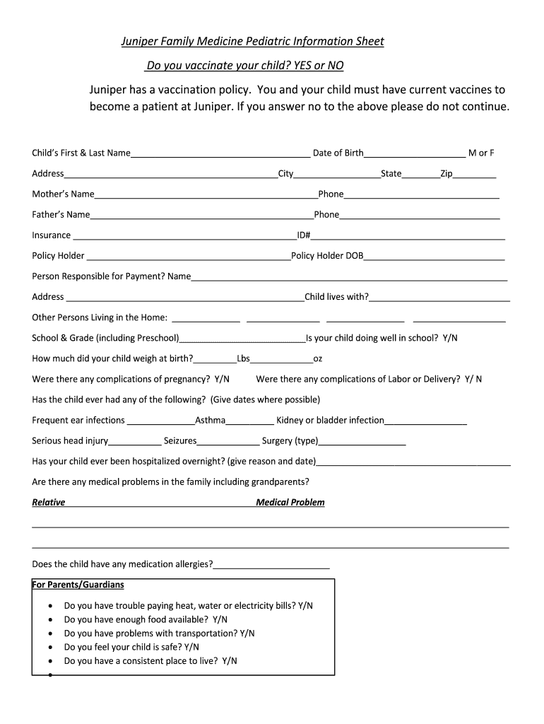 Get the free Juniper Family Medicine Pediatric Information Sheet