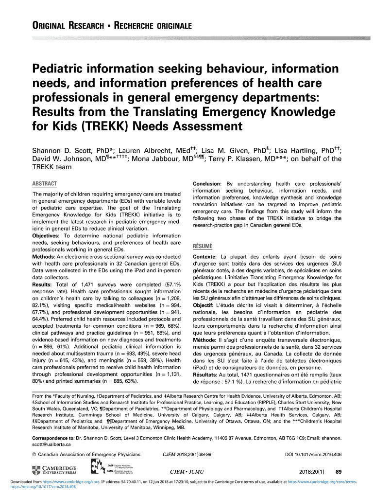 ORIGINAL RESEARCH RECHERCHEORIGINALEPediatric information seeking behavior, information needs, and information preferences of health care professionals in general emergency departments: Results from