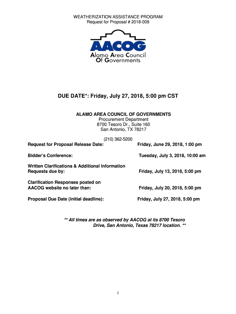 WEATHERIZATION ASSISTANCE PROGRAM Request for Proposal # 2018009DUE DATE*: Friday, July 27, 2018, 5:00 pm CATALAN AREA COUNCIL OF GOVERNMENTS Procurement Department 8700 Resort Dr., Suite 160 San