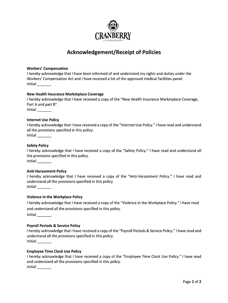 Acknowledgement/Receipt of Policies Workers Compensation I hereby acknowledge that I have been informed of and understand my rights and duties under the Workers Compensation Act and I have received