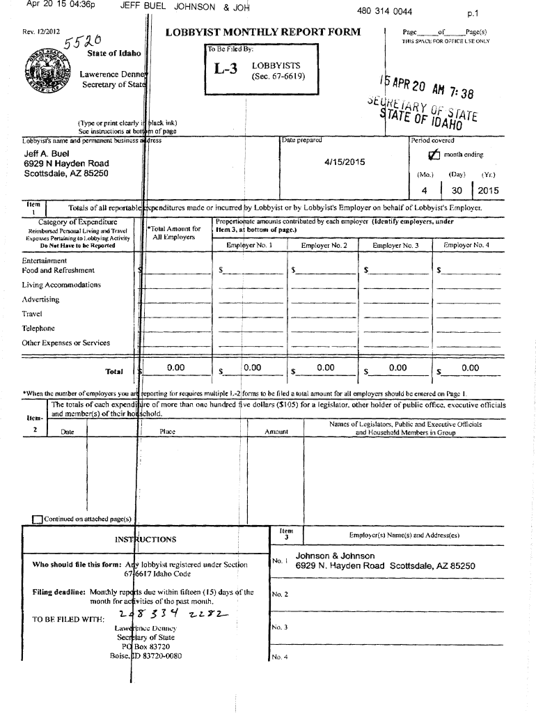 Apr 20 15 04:36pRev. 12/2012.r:JEFF BUELJOHNSON&JO480 314 0044LOBBYIST Montiel. Y REPORT FORM5S 0Pagc of Page(s) bliss ', CE FOR Office LSE Only Be Filed By:State of IdahoLOBBYISTS (Sec. 6766 l 9)L3Lawerence
