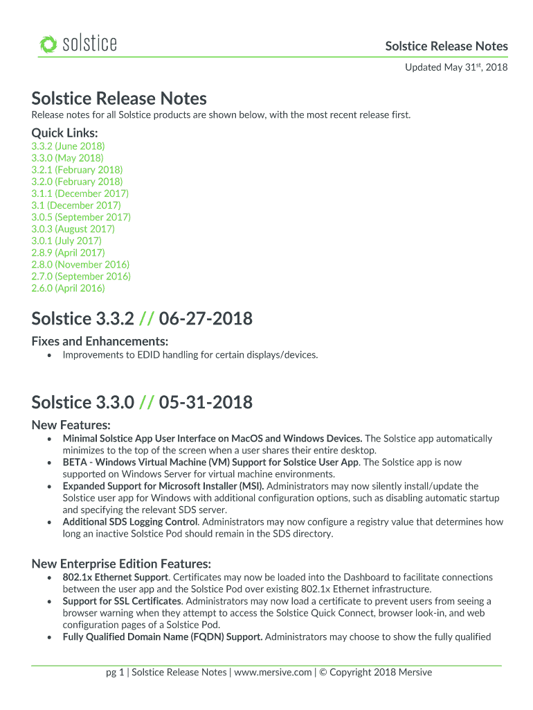 Updated May 31st, 2018Solstice Release NotesRelease notes for all Solstice products are shown below, with the most recent release first. Quick Links:3.3.2 (June 2018)