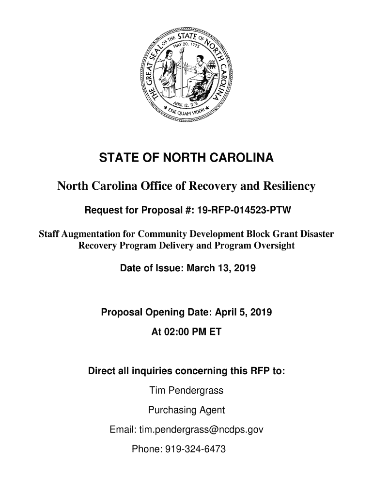 STATE OF NORTH CAROLINA Office of Recovery and Resiliency Request for Proposal #: 19RFP014523PTW Staff Augmentation for Community Development Block Grant Disaster Recovery Program Delivery and Program