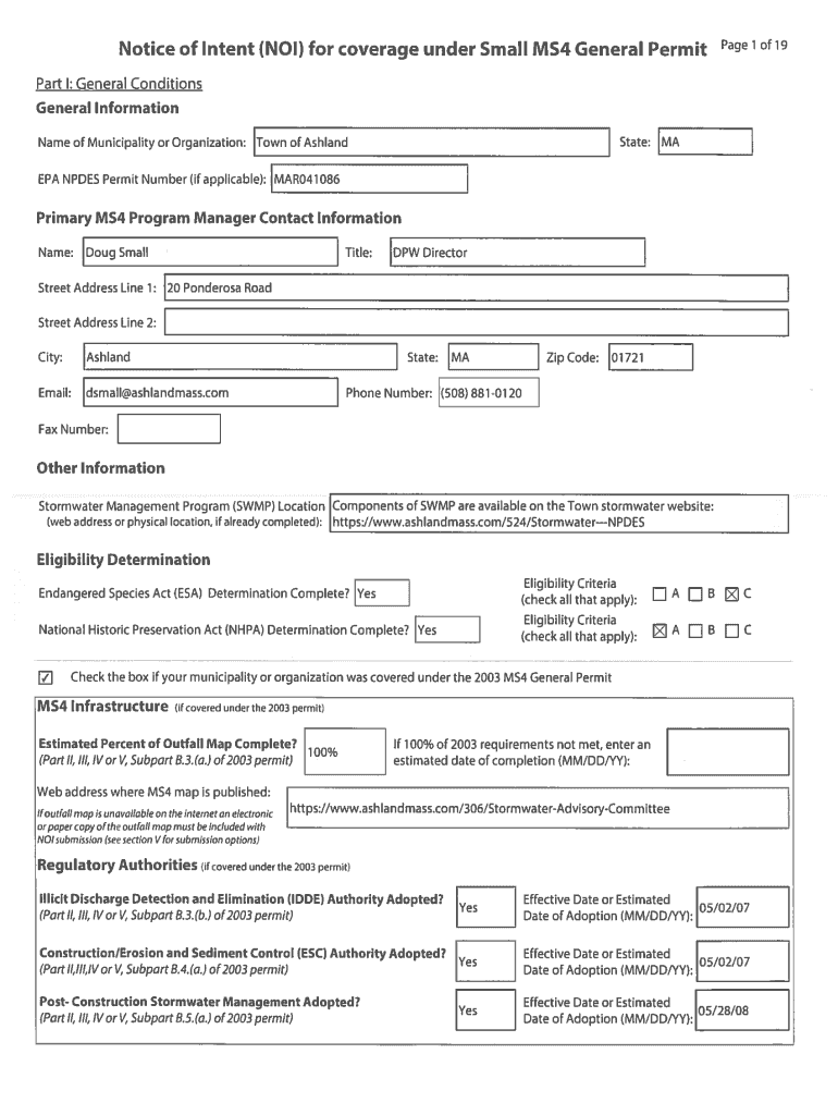 Get the free Notice of Intent (NOI) for coverage under Small MS4 General Permit for Ashland, MA. ...