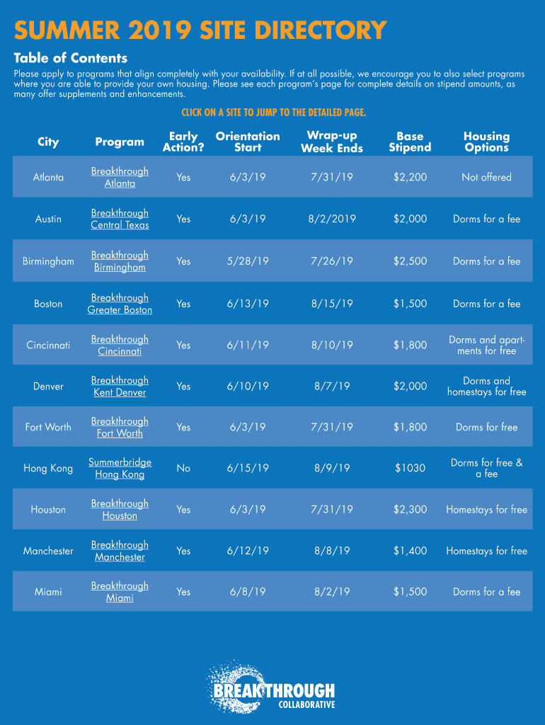 SUMMER 2019 SITE DIRECTORY Table of Contents Please apply to programs that align completely with your availability. If at all possible, we encourage you to also select programs where you are able