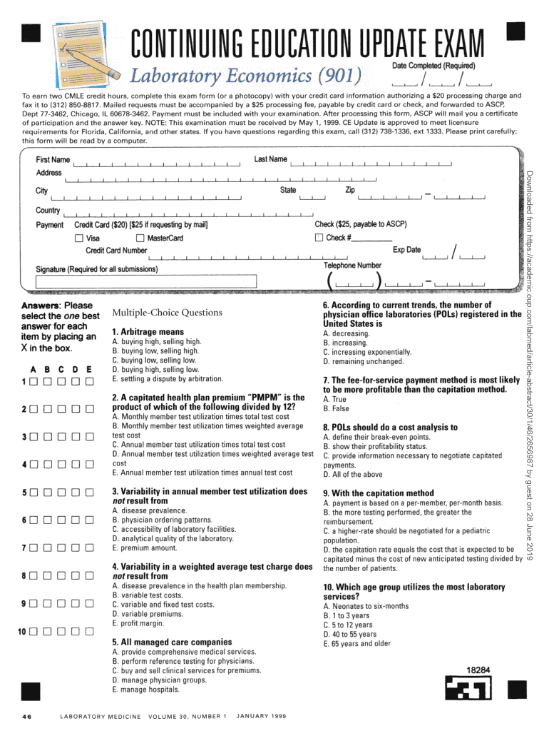 CONTINUING EDUCATION UPDATE EXAM it, ./ss4 Date Completed (Required)Laboratory Economics (901) / / i To earn two COLE credit hours, complete this exam form (or a photocopy) with your credit card information