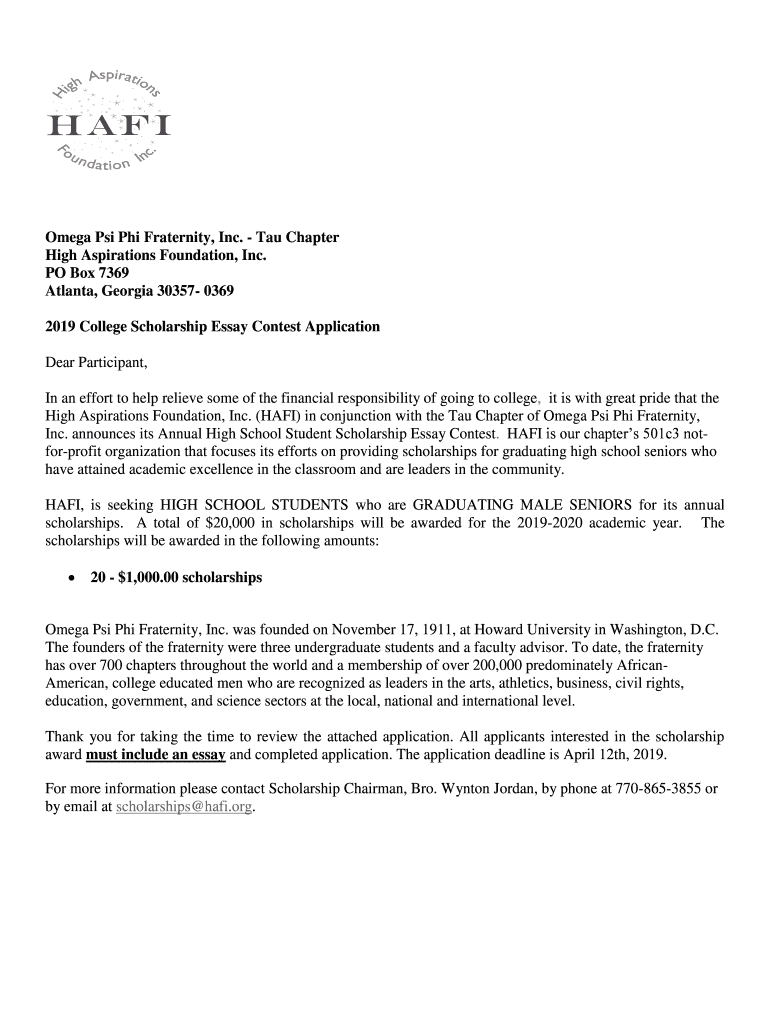 Omega Psi Phi Fraternity, Inc. Tau Chapter High Aspirations Foundation, Inc. PO Box 7369 Atlanta, Georgia 30357 0369 2019 College Scholarship Essay Contest Application Dear Participant, In an effort