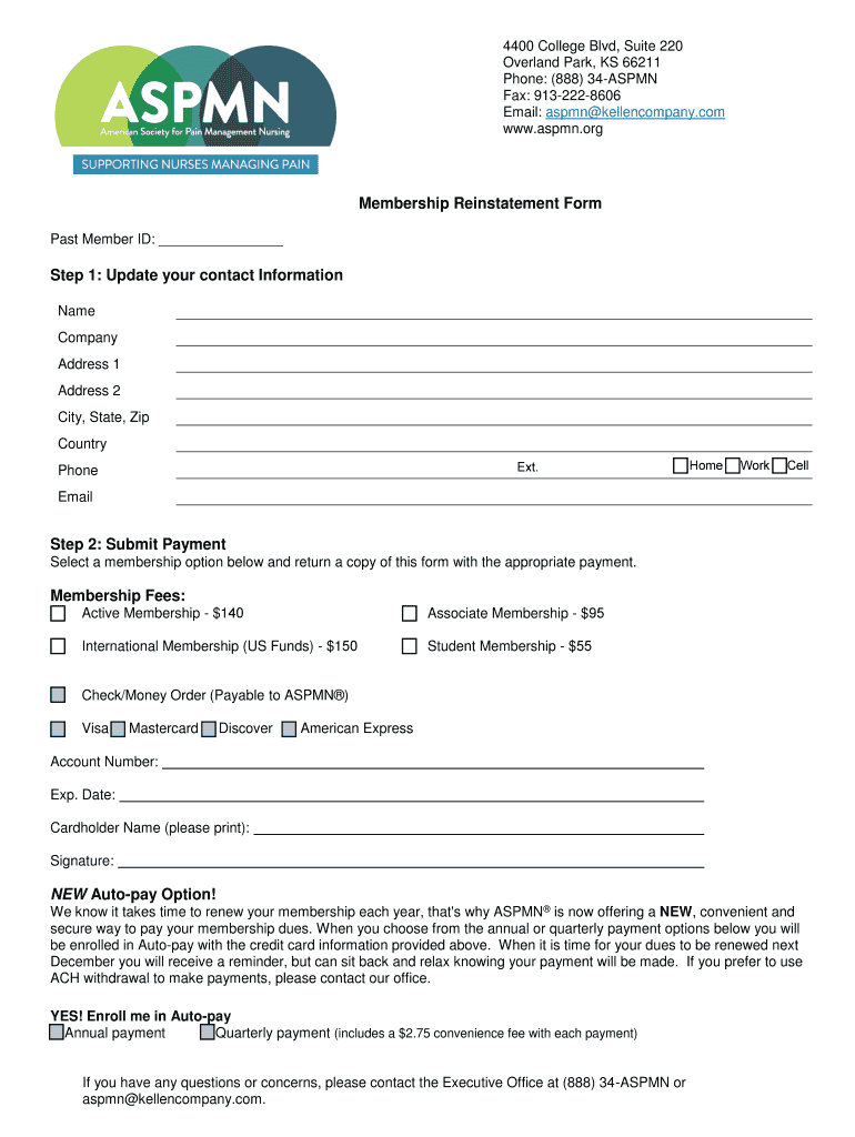 4400 College Blvd, Suite 220 Overland Park, KS 66211 Phone: (888) 34ASPMN Fax: 9132228606 Email: Aspen kellencompany.com www.aspmn.orgMembership Reinstatement Form Past Member ID: Step 1: Update your